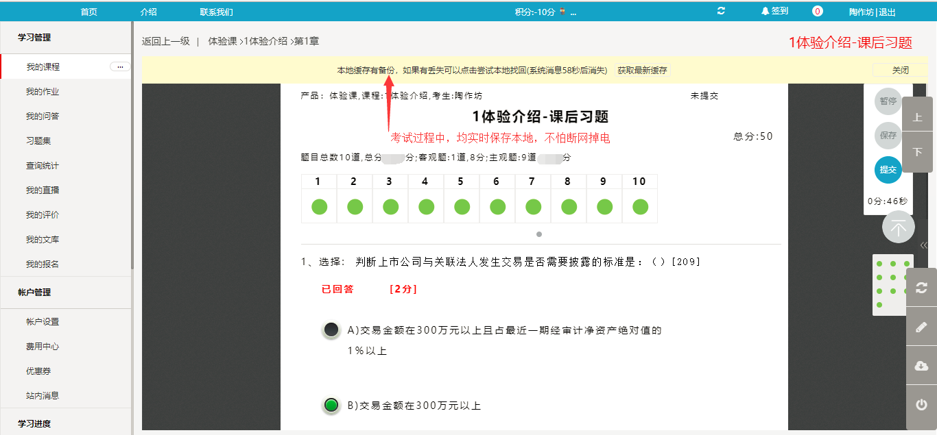 所有答題過程,實時記錄本地,并且無法破譯。斷網(wǎng)后,支持繼續(xù)答題,所有題目包括上傳附件均會保留在本地。等網(wǎng)絡(luò)通后上傳。掉電重啟也不怕,所有答題都會保留 ,限時考試計時也會繼續(xù)計時