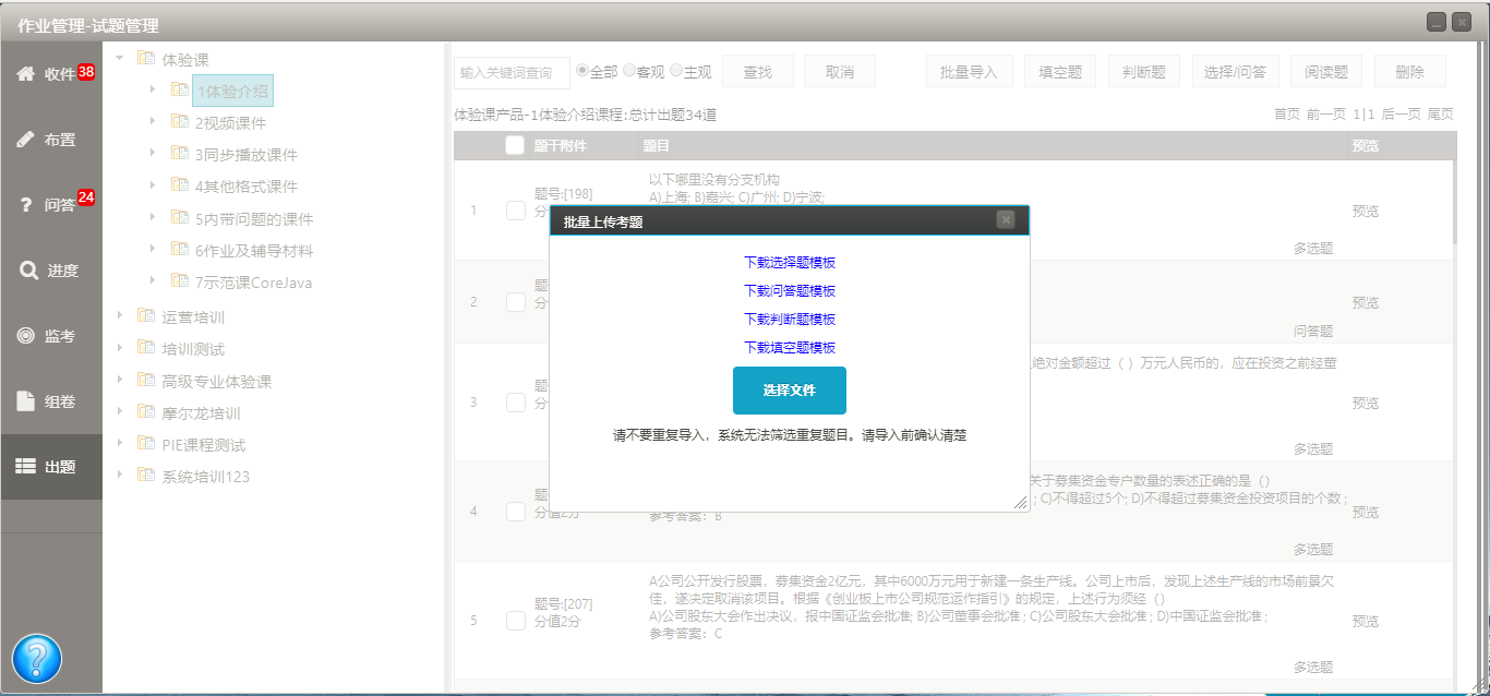 當(dāng)需要隨機(jī)出題,系統(tǒng)可以從指定的出題范圍,按照策略自動組卷。當(dāng)線下已經(jīng)有現(xiàn)成的卷子,錄入模板導(dǎo)入即可。您可以推送考試給考生,也可以放到課程里 ,做為課后作業(yè),作為固定的教學(xué)環(huán)節(jié)...